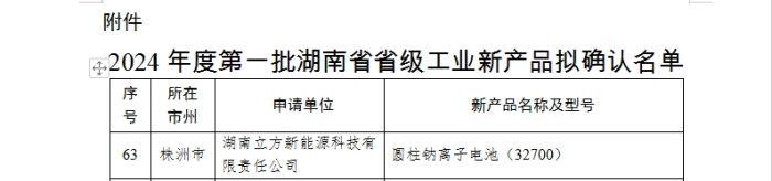 近日,湖南省工业和信息化厅发布了《关于2024年度第一批“湖南省省级工业新产品”拟确认名单的公示》,湖南立方新能源科技有限责任公司(下称“立方新能源”)圆柱钠离子电池32700获评2024年度“湖南省省级工业新产品”。