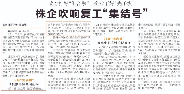 2月21日,株洲日报记者走进立方复工现场,立方一手抓防疫,一手抓生产的场景记录在《政府打好“组合拳” 企业下好先手棋——株企吹响复工“集结号”》中。