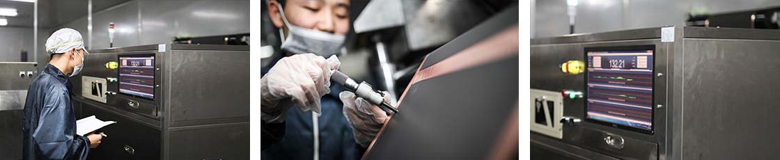 采用国内辊压机,压力高精度调节,激光在线全程厚度一致性监控,双面同步加压。使碾压厚度严格控制于±3μm公差,并实现数据实施传输与追溯。