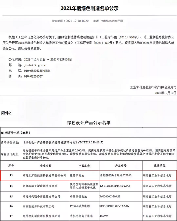 喜讯频传!近日,国家工业和信息化部公示了2021年度绿色制造名单,立方“消费型锂离子电池”成功入选国家级绿色设计产品!