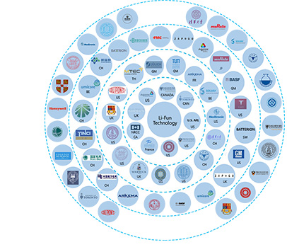 在这些合作的名单里,有3M、斯坦福、牛津大学、华威大学、帝国理工大学、加州伯克利分校这样的国际知名院校,也有清华大学、浙江大学、中南大学这样的国内名校,与中化蓝天,国家电网,南方电网,霍尼韦尔,Bruckner,FMC知名企业合作,大家一起共享专利池,共谋锂电发展。